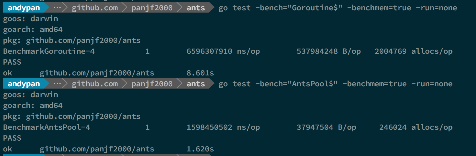 • BenchmarkPoolGroutine-4 represent the benchmarks with a ants pool.